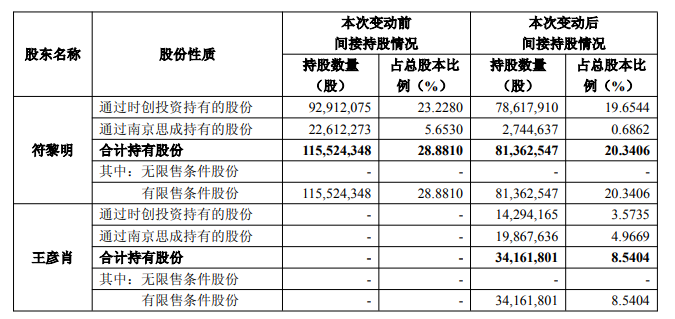本次间接持股变动前,符黎明未直接持有公司股份,持有时创投资65.00%的股权和南京思成16.48%的财产份额,合计间接持有115,524,348股公司股份,约占公司总股本的28.88%。